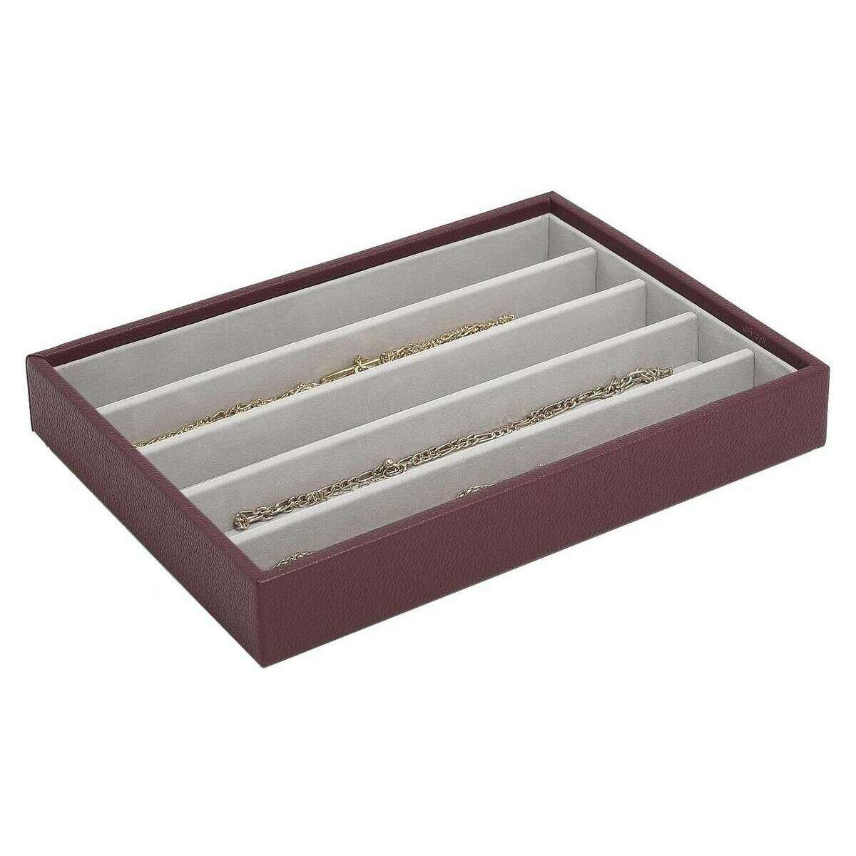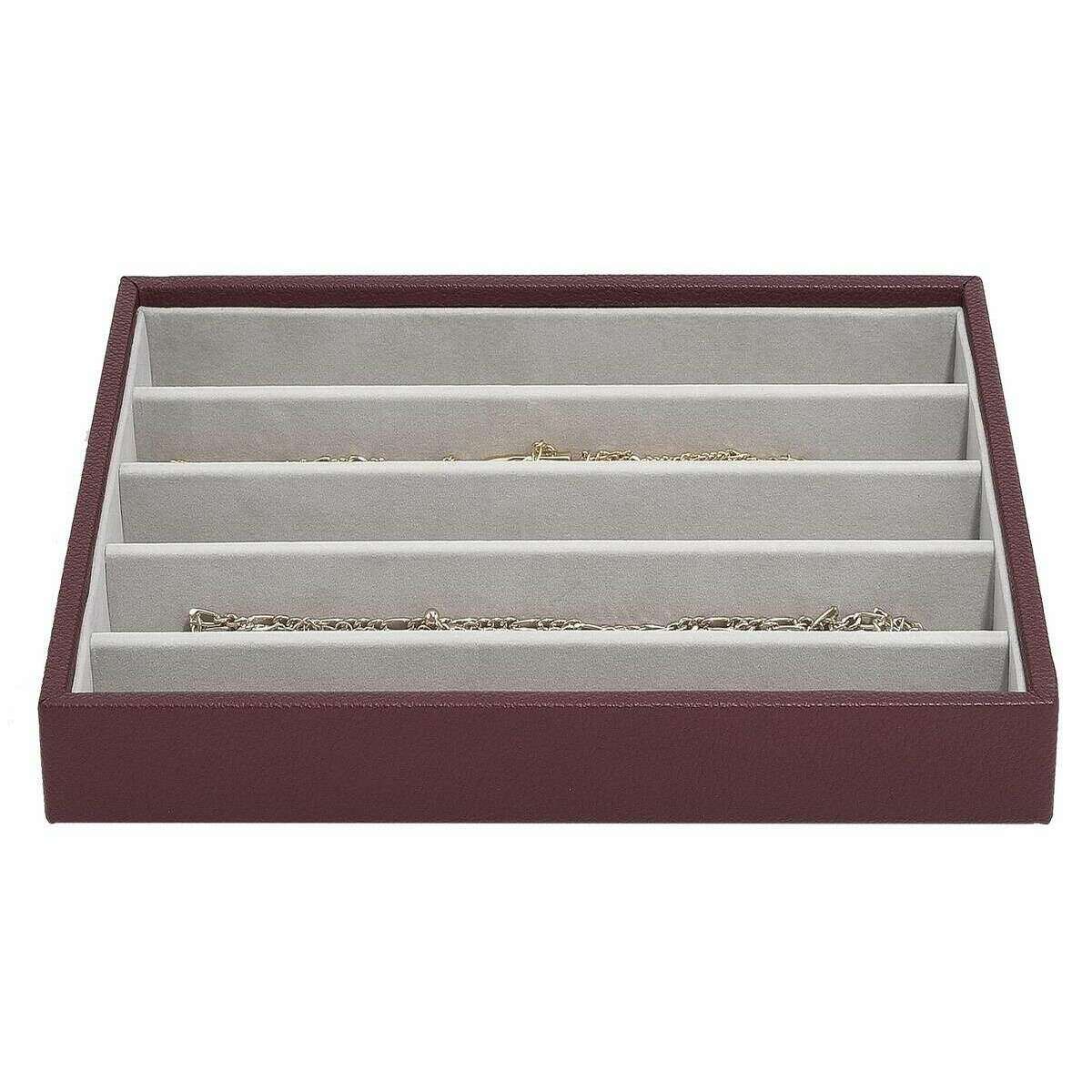 This well made women's classic necklace layer from Stackers comes in a burgundy colour and is manufactured from faux leather and velvet. It measures 3.7cm(height) x 25cm(width) x 18cm(depth). All the jewellery boxes come complete with stackers packaging. The Stackers Classic Necklace Layer - Burgundy features multiple sections for all your necklaces. This beautiful classic burgundy jewellery layer is perfect for keeping organised as it has five sections.