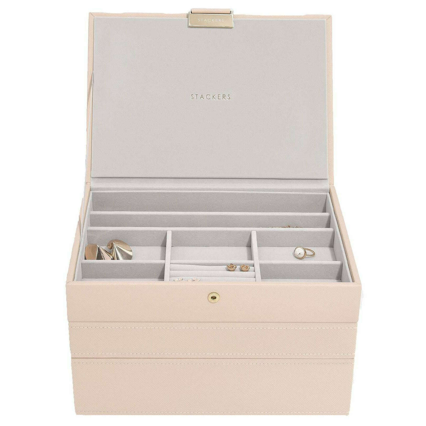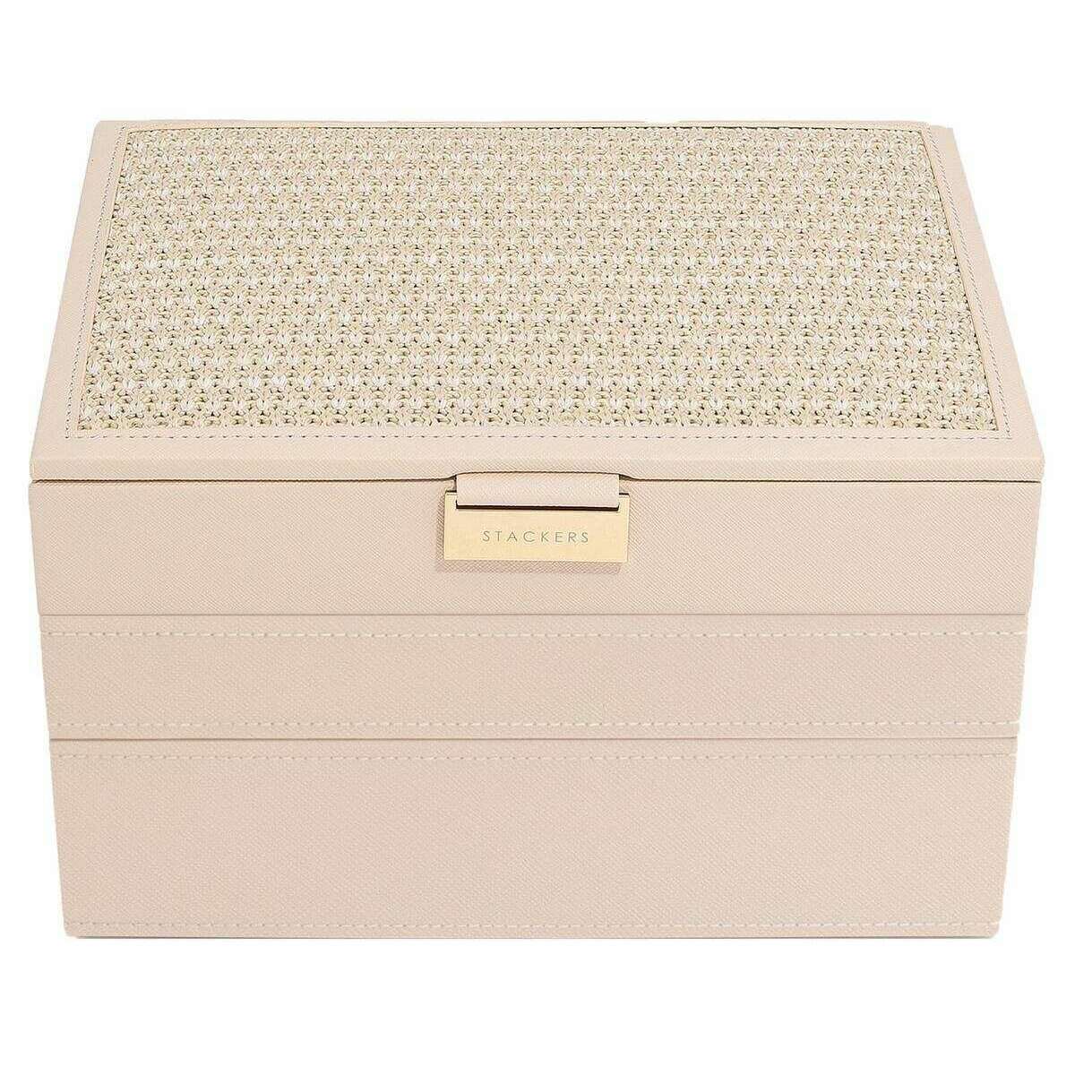 Brought to you by the brand Stackers, this blush pink raffia women's classic set of 3 jewellery box is made from faux leather and velvet. It measures 13.7cm(height) x 25cm(width) x 18cm(depth). All the jewellery boxes come complete with stackers packaging. The Stackers Classic Set of 3 Jewellery Box - Blush Pink Raffia features a unique pink raffia jewellery box design. This jewellery box is perfect for storing all your jewellery items! Comes complete with three layers and multiple sized sections for earrings, rings and bracelets and a larger section for watches and bangles.