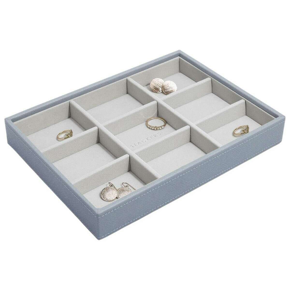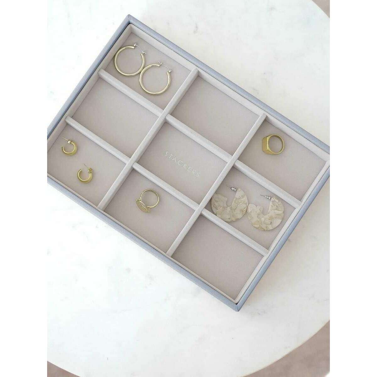 Designer Stackers has brought you this women's faux leather and velvet jewellery box using dusky blue tones. It measures 3.7cm(height) x 25cm(width) x 18cm(depth). It is recommended to wipe clean to keep this jewellery box in good condition. All the jewellery boxes come complete with stackers packaging. The Stackers Classic Statement Layer - Dusky Blue has been cleverly created and designed to hold all of your earrings, rings or hair clips perfectly. It can be added to any other classic jewellery tray to create a jewellery box or it can be used on its own. You won't have to compromise on organisation.