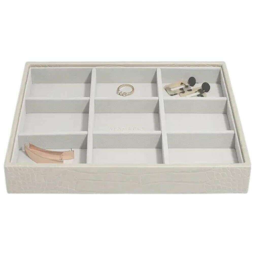 This classic statement layer for women is fashioned by the brand Stackers in a grey colour and is made from faux leather and velvet. It measures 3.7cm(height) x 25cm(width) x 18cm(depth). It is recommended to wipe clean to keep this jewellery box in good condition. All the jewellery boxes come complete with stackers packaging. The Stackers Classic Statement Layer - Putty Grey has been cleverly created and designed to hold all of your earrings, rings or hair clips perfectly. It can be added to any other classic jewellery tray to create a jewellery box or it can be used on its own. You won't have to compromise on organisation.