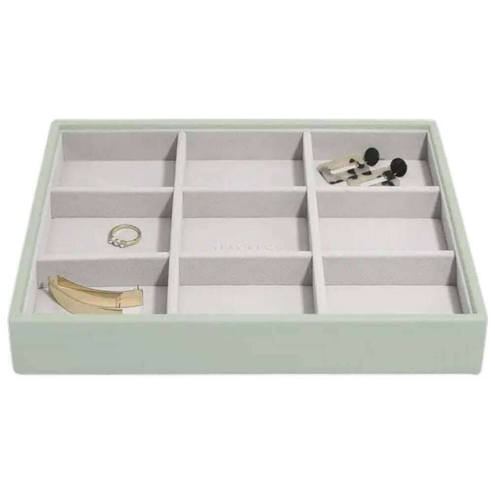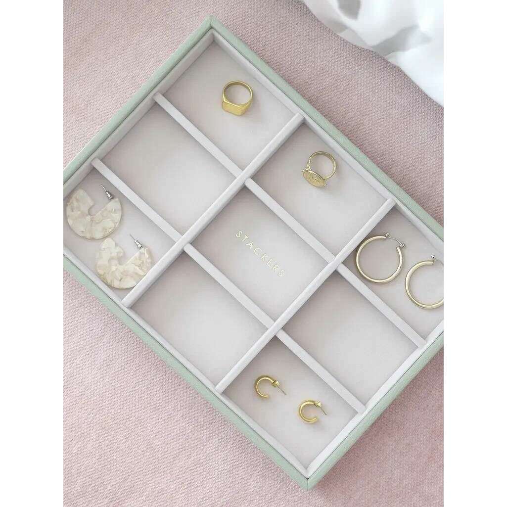 Introducing this women's classic statement layer by Stackers, it is manufactured from faux leather and velvet in a sage green colour. It measures 3.7cm(height) x 25cm(width) x 18cm(depth). It is recommended to wipe clean to keep this jewellery box in good condition. All the jewellery boxes come complete with stackers packaging. The Stackers Classic Statement Layer - Sage Green has been cleverly created and designed to hold all of your earrings, rings or hair clips perfectly. It can be added to any other classic jewellery tray to create a jewellery box or it can be used on its own. You won't have to compromise on organisation.