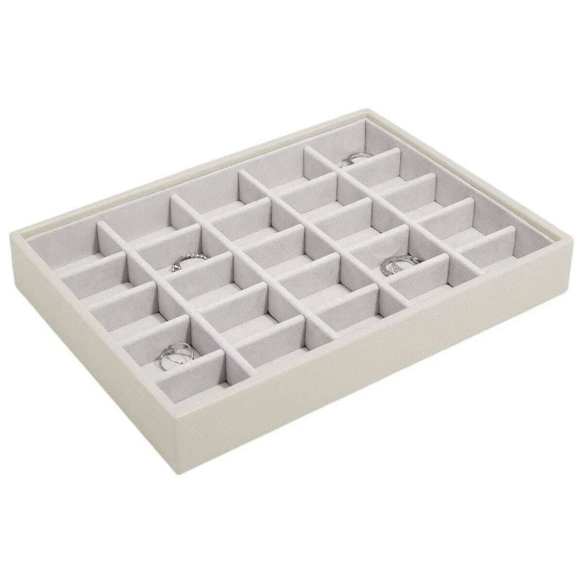 Manufactured from faux leather and velvet is this oatmeal women's classic trinket layer by the designer Stackers. It measures 3.7cm(height) x 25cm(width) x 18cm(depth). It is recommended to wipe clean to keep this jewellery box in good condition. All the jewellery boxes come complete with stackers packaging. The Stackers Classic Trinket Layer - Oatmeal is a great layer for smaller jewellery such as rings, earrings or charms. Offering 25 equal compartments, it is a simple, yet practical organiser for your loose jewellery so they can be stored safely in one place for when you need to grab them. The luscious velvet lining is soft against your accessory, keeping them in immaculate condition. This piece can pair with other Stackers pieces to create a tailored jewellery box to fit your needs.