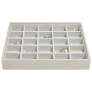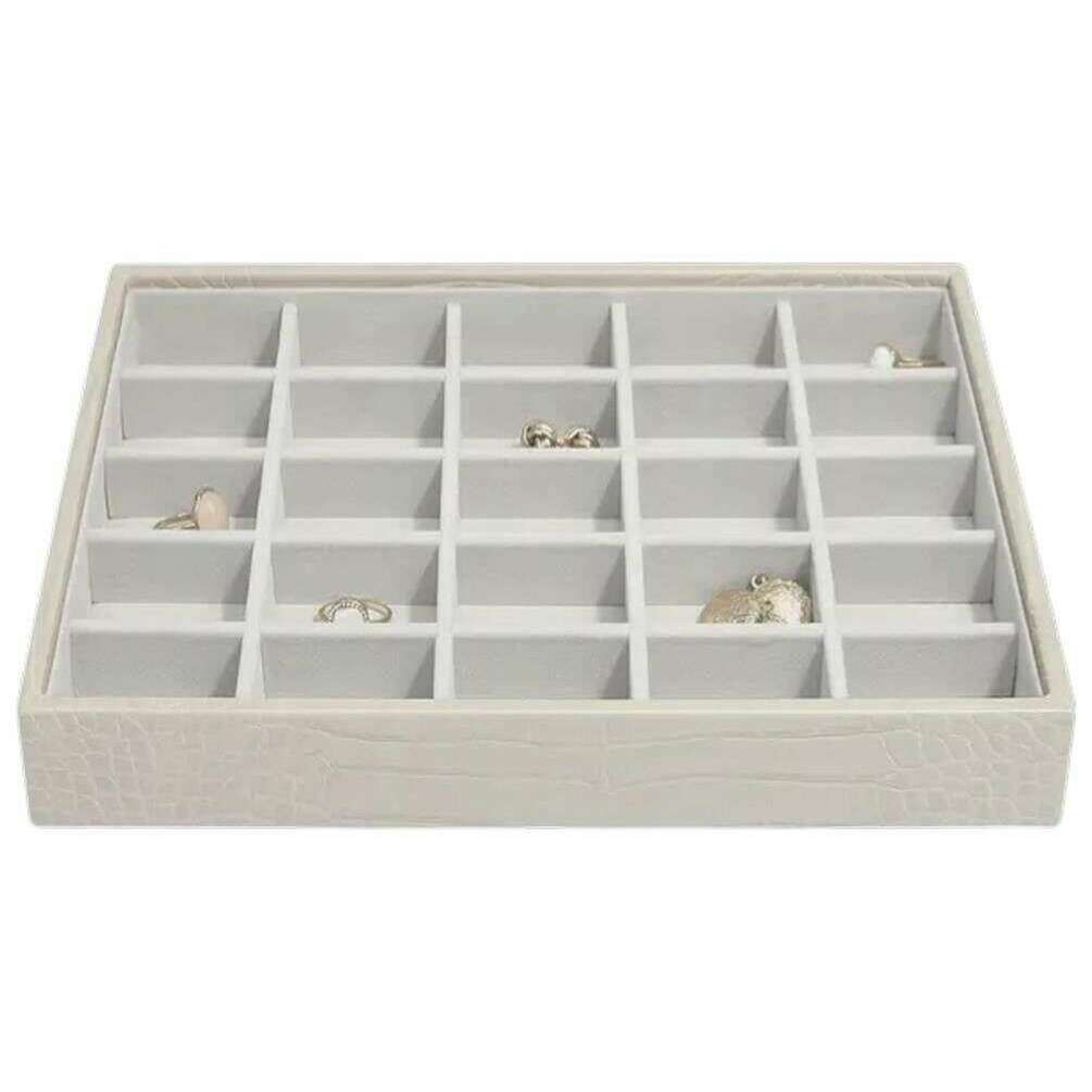 This well made women's classic trinket layer from Stackers comes in a putty grey colour and is manufactured from faux leather and velvet. It measures 3.7cm(height) x 25cm(width) x 18cm(depth). It is recommended to wipe clean to keep this jewellery box in good condition. All the jewellery boxes come complete with stackers packaging. The Stackers Classic Trinket Layer - Putty Grey is a great layer for smaller jewellery such as rings, earrings or charms. Offering 25 equal compartments, it is a simple, yet practical organiser for your loose jewellery so they can be stored safely in one place for when you need to grab them. The luscious velvet lining is soft against your accessory, keeping them in immaculate condition. This piece can pair with other Stackers pieces to create a tailored jewellery box to fit your needs.