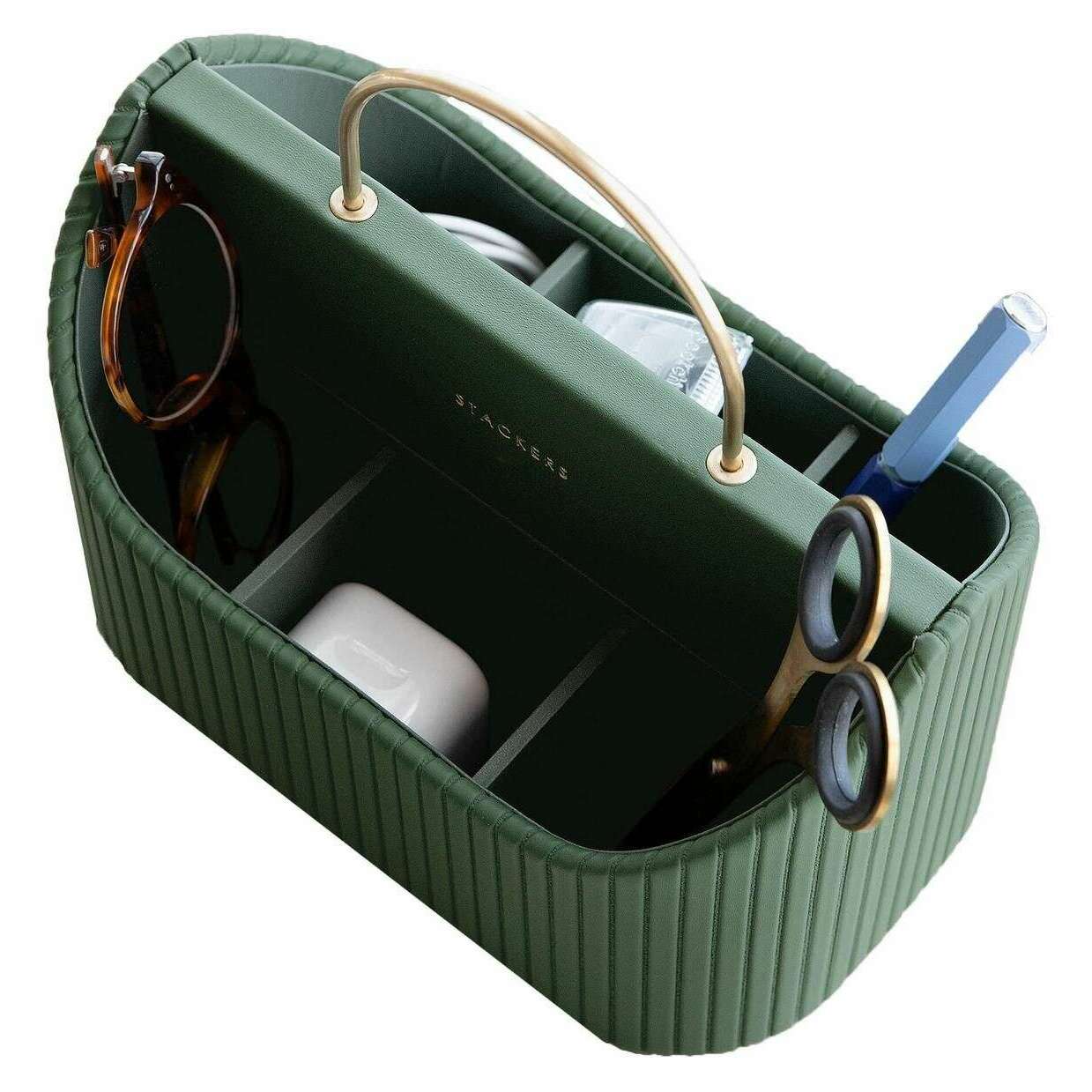 Perfect for women is this Stackers emerald green desk caddy, it is also made from faux leather. It measures 21cm(height) x 21cm(width) x 13cm(depth). All the desk accessories come complete with stackers packaging. The Stackers Desk Caddy - Emerald Green is a must have for any desk! This green desk caddy is perfect for storing stationary and even has a handle which makes it easily portable.