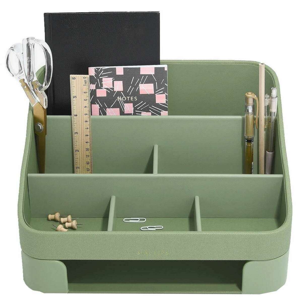 Introducing this women's desk organiser set by Stackers, it is manufactured from faux leather in a pistachio green colour. It measures 20cm(height) x 25cm(width) x 33cm(depth). All the desk accessories come complete with stackers packaging. The Stackers Desk Organiser Set - Pistachio Green features a beautiful green design. This desk organiser has many sections for stationary, notebooks and many more trinkets. Comes complete with a letter tray for extra storage.