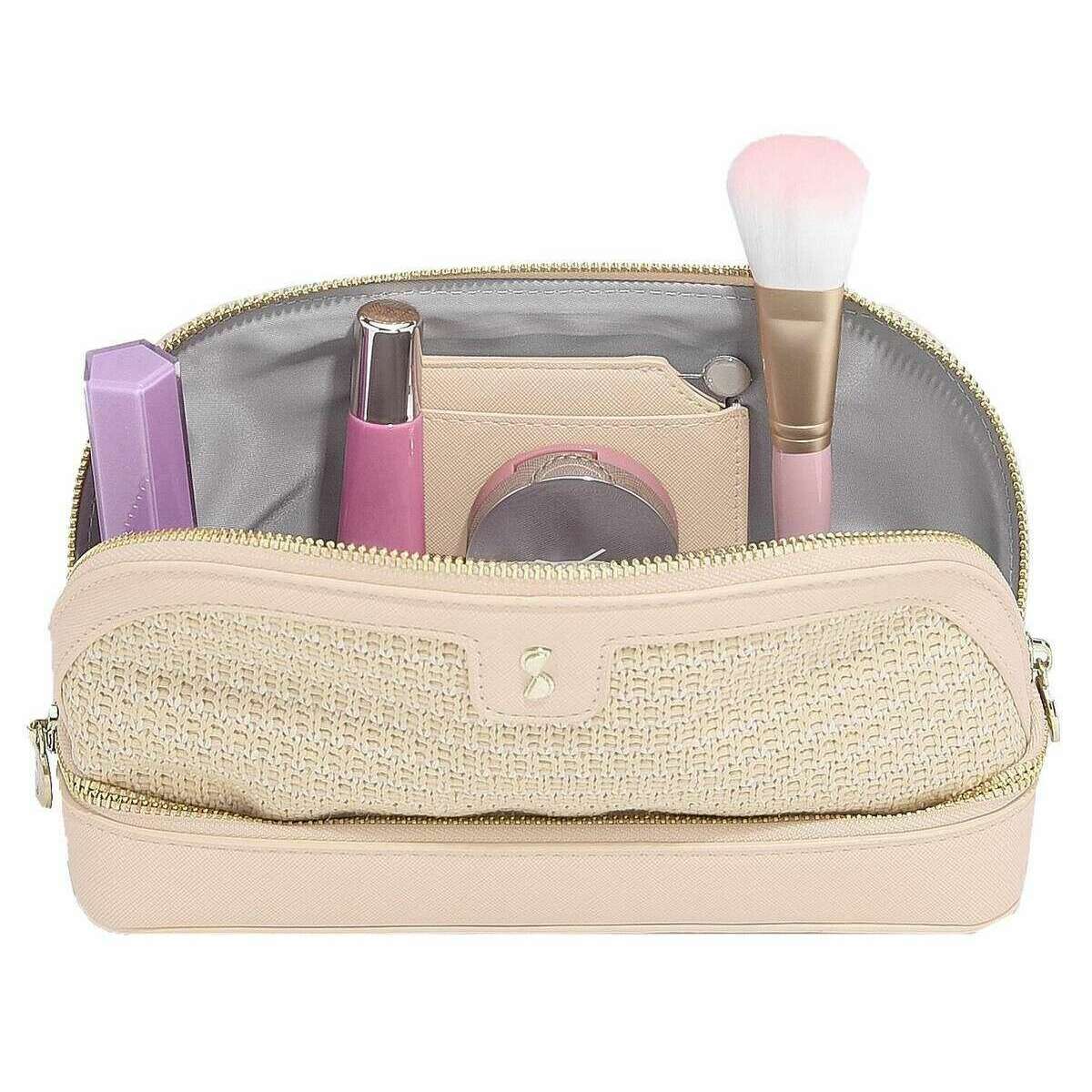 Manufactured from raffia effect and faux leather is this blush pink raffia women's raffia cosmetic bag by the designer Stackers. It measures 15cm(height) x 8.5cm(width) x 24cm(depth). All the bags come complete with stackers packaging. The Stackers Raffia Cosmetic Bag - Blush Pink Raffia is a must have when on the go! This unique and trendy pink raffia cosmetic bag features a large storage space for all your make up and skin care as well as a small handy mirror. Theres also a bottom compartment which you can zip up for added storage and security.