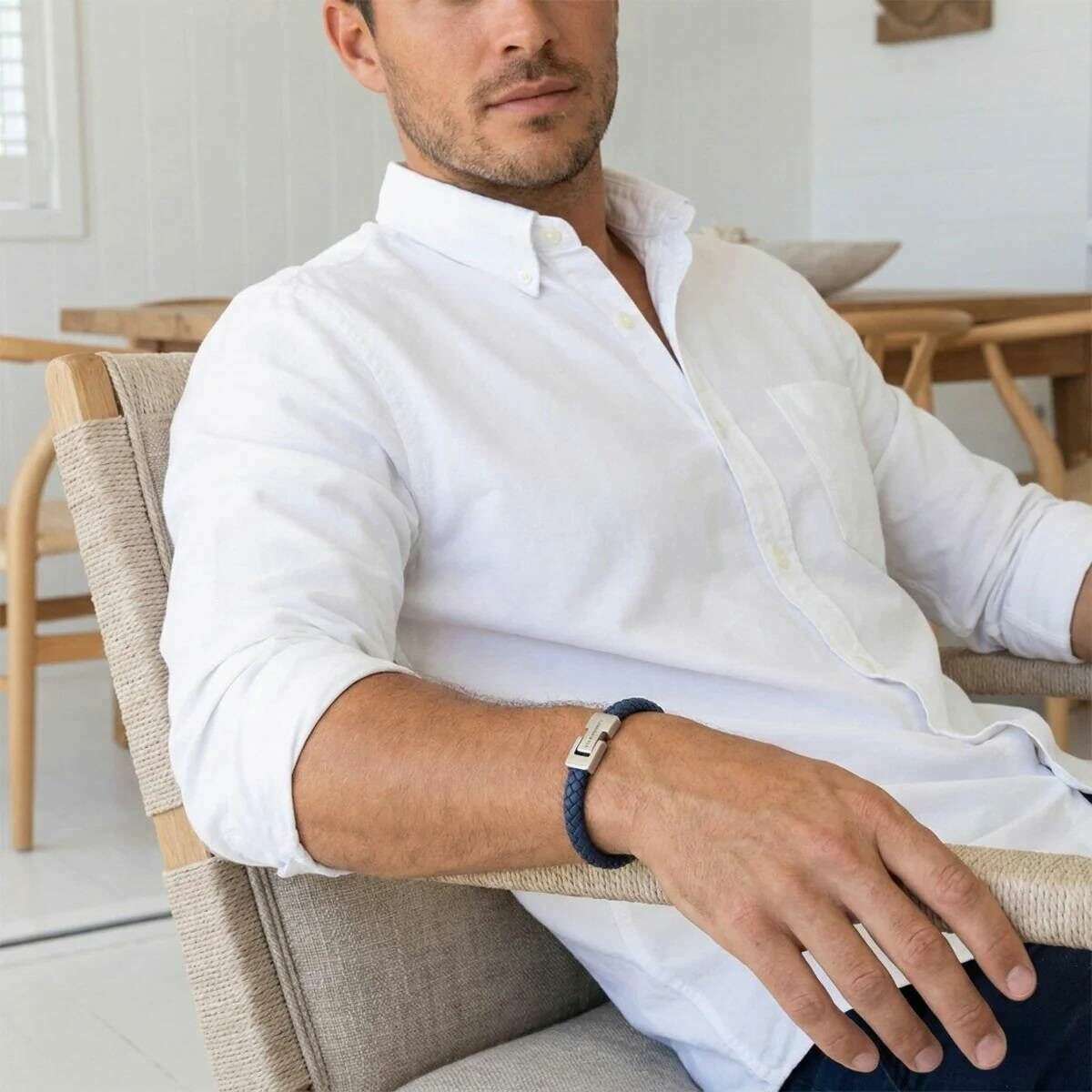 This men's archie braided leather bracelet has been made from 100% nappa leather and stainless steel, featured in a blue colour and is from the brand Steel & Barnett. All the bracelets come complete with steel & barnett packaging. The Steel & Barnett Archie Braided Leather Bracelet - Jeans Blue embodies the perfect balance of simplicity and elegance. Expertly hand crafted from genuine Nappa leather, its smooth 8mm band delivers a clean, minimalist aesthetic suitable for any style. The design is elevated by a signature brushed silver clasp, finely engraved with the STEEL & BARNETT logo, offering a subtle touch of distinction. Built for longevity, the bracelet features a high?grade 316L stainless steel clasp, celebrated for its durability and corrosion resistance. Its magnetic fastening ensures effortless wear, providing a secure and comfortable fit throughout the day. Versatile and refined, the Archie transitions seamlessly from formal occasions to casual settings, adding a layer of understated sophistication to every outfit.