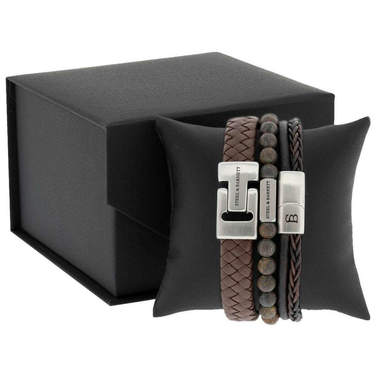 This men's premium triple bracelet gift set by the brand Steel & Barnett is made from 100% leather, stainless steel and gemstones and is showcased in brown. All the bracelets come complete with steel & barnett gift box. The Steel & Barnett Premium Triple Bracelet Gift Set - Brown delivers a masterful blend of earthy tones, premium materials, and timeless craftsmanship. This thoughtfully curated trio brings together rich brown braided leather, natural stone beads, and sleek rope elements, resulting in a look that is both rugged and refined. Each piece balances texture and tone, creating a cohesive set that stands out through subtle sophistication. Warm brown hues are elevated by brushed stainless steel accents, adding visual depth and enhancing the set s versatile appeal. Designed for both effortless layering and striking standalone wear, these bracelets offer limitless styling potential equally suited for everyday outfits or elevated occasions. Crafted for the man who values style, character, and authenticity, the Premium Bracelet Set Brown makes a meaningful addition to any jewelry collection and an exceptional gift for those who appreciate refined, modern craftsmanship.