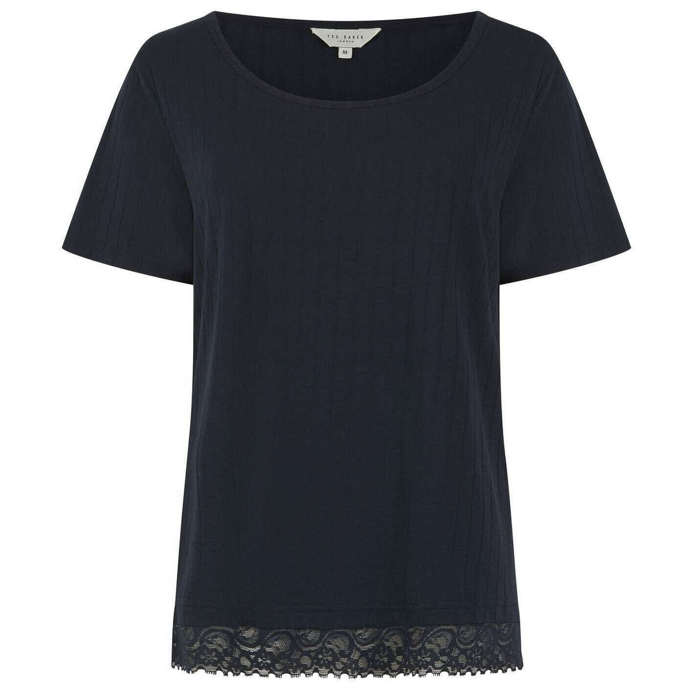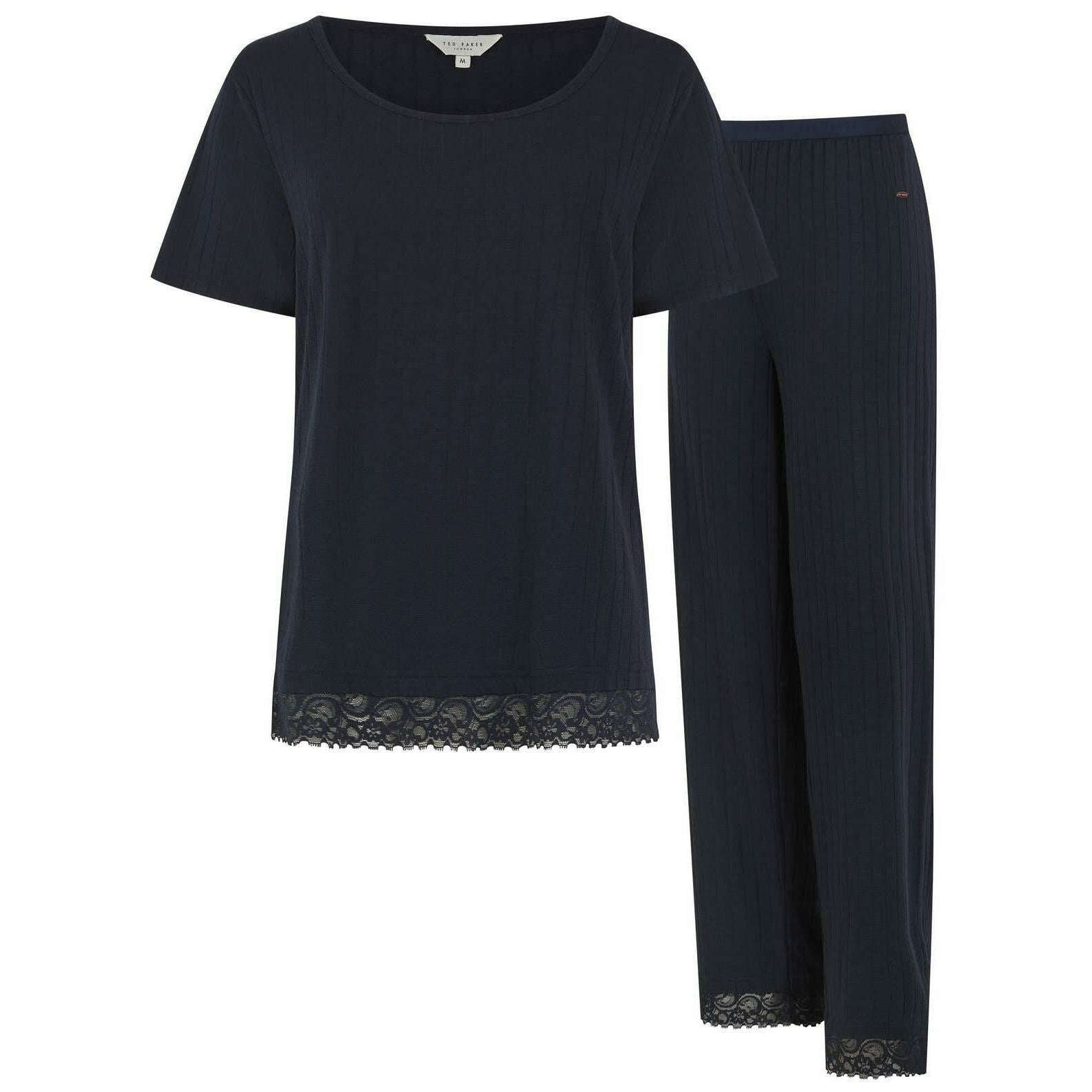 Manufactured from 63% polyester, 34% viscose and 3% lycra are these after midnight navy women's betty wide leg pyjama set by the designer Ted Baker. Also the after midnight navy pyjamas are designed in a plain pattern, All the pyjamas come complete with ted baker packaging. The Ted Baker Betty Wide Leg Pyjama Set - After Midnight Navy are a must have set for women looking for comfort and style in one. The wide neck t-shirt style top features a loose fit for optimal comfort whilst having a lace trim on the bottom for depth. The bottoms also feature a loose fit, an elasticated waistband for the perfect fit and more lace on the bottom. These soft and cuddly pjs are great for lounging in or sleeping in. Finished with a Ted Baker metal embellishment tag on both top and bottom.