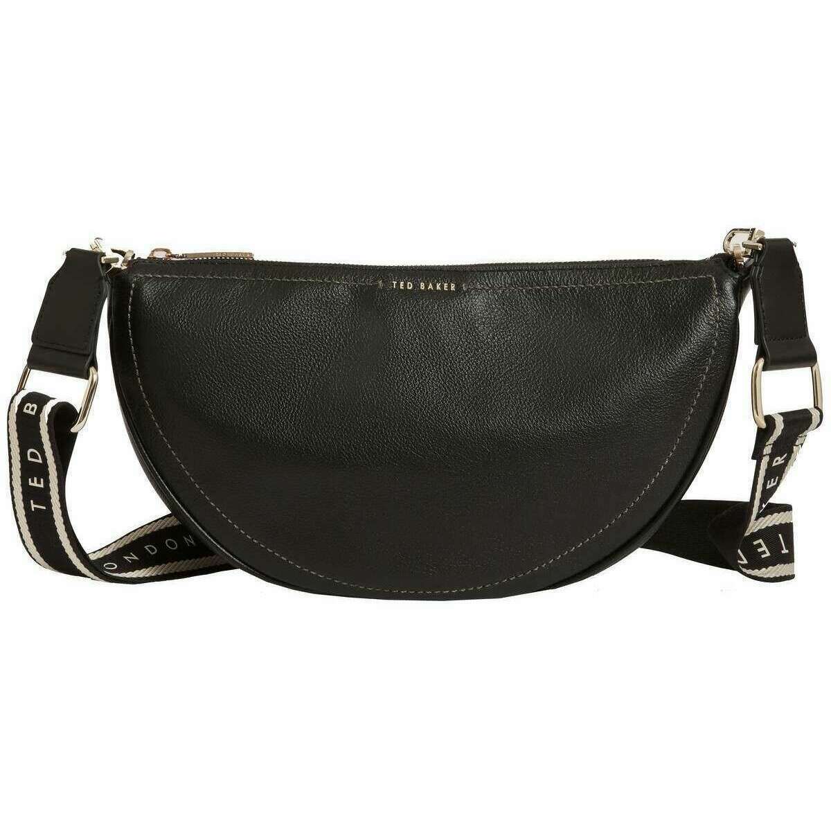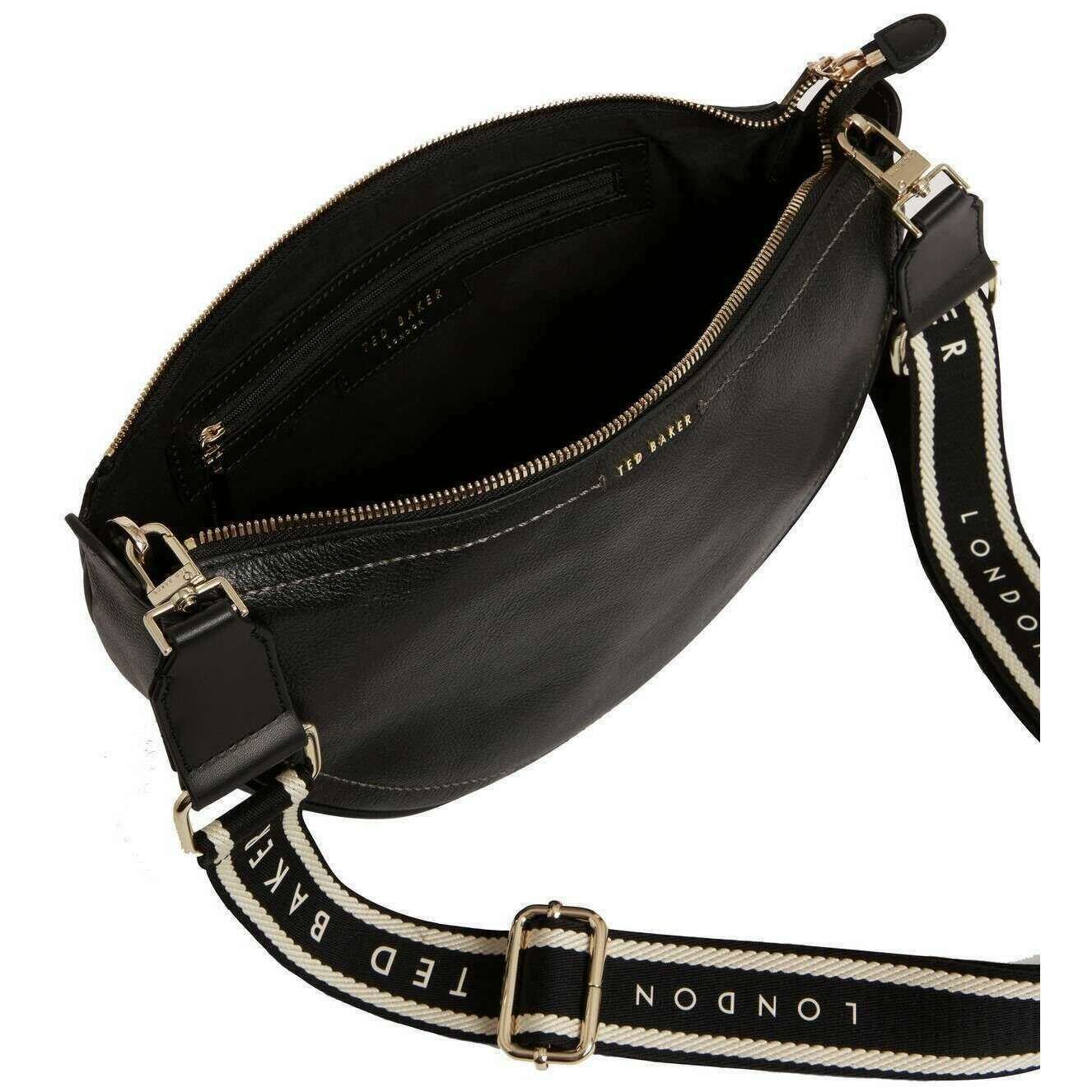 This women's lorreen webbing leather half moon crossbody bag has been made from 100% bovine leather, featured in a black colour and is from the brand Ted Baker. It measures 18cm(height) x 30cm(width) x 8cm(depth). All the bags come complete with ted baker dust bag. The Ted Baker Lorreen Webbing Leather Half Moon Crossbody Bag - Black is made to suit an everyday look to night attire with the versatile styling options. This hands-free bag has been completely crafted from high-quality leather that is made to last. Featuring a stitched front detail to add depth and dimension to your look, an adjustable branded strap for endless stylish options and an interior pocket for organisation. Even though this bag may look small and compact it has a surprisingly large main compartment that is great at holding all of your essentials.