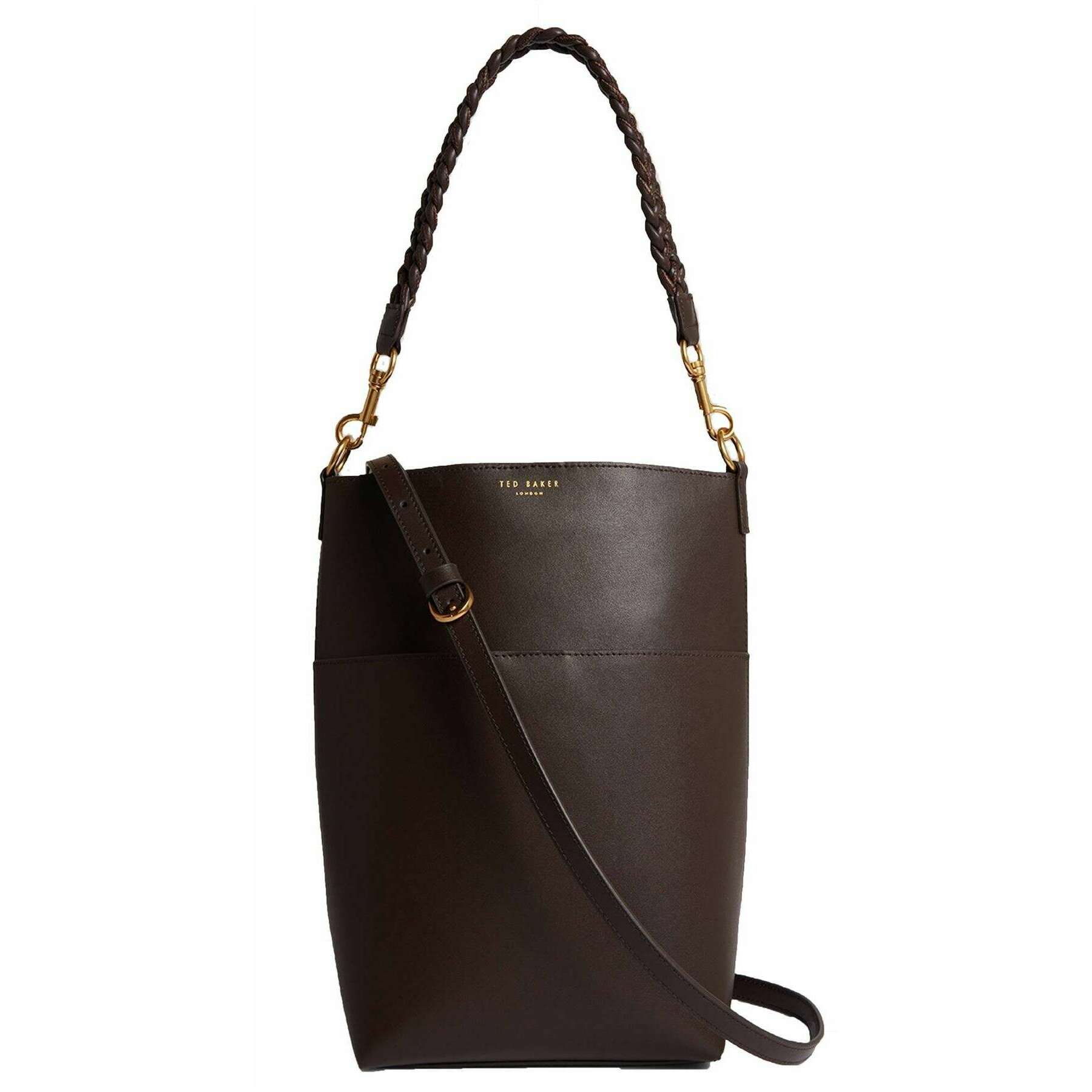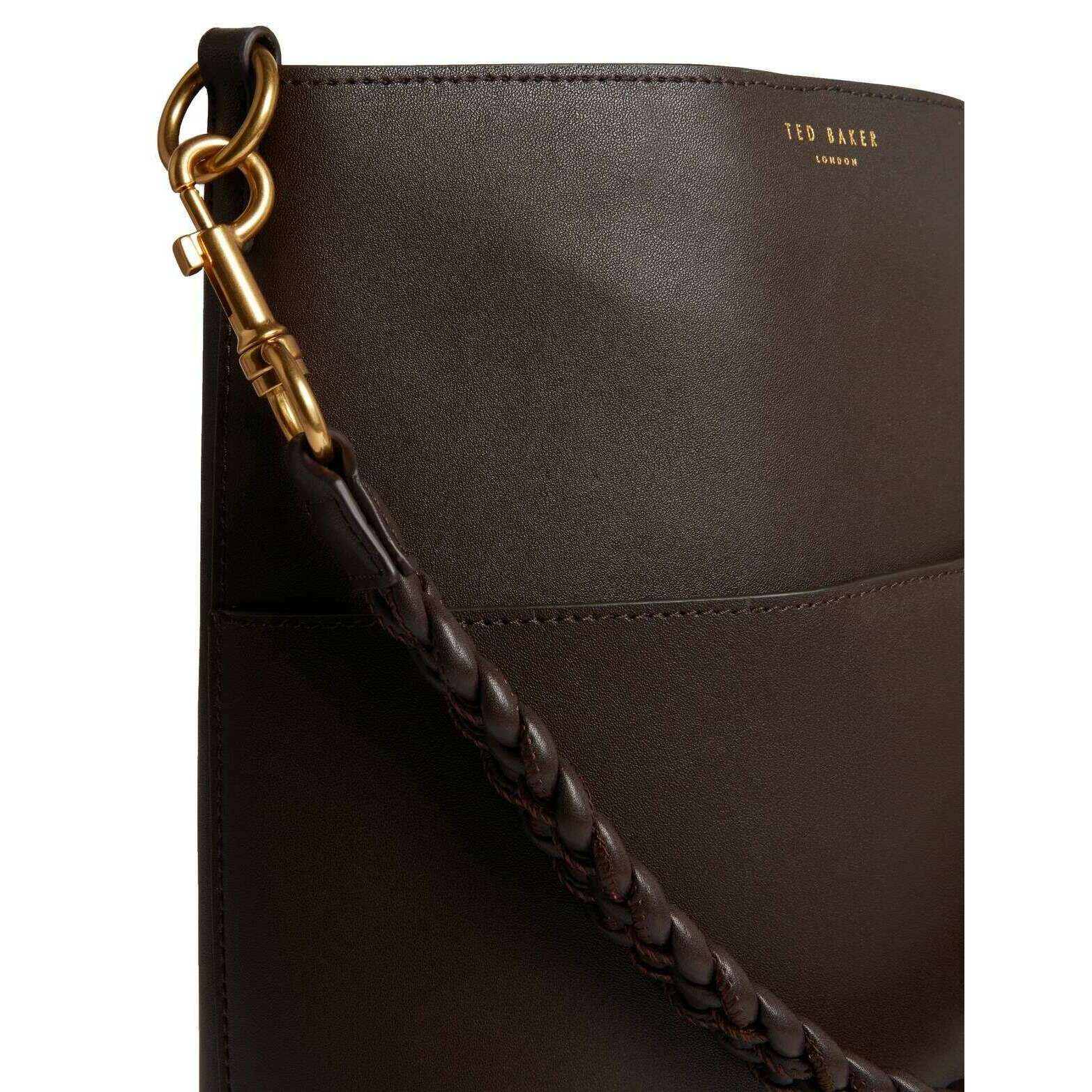 This women's wannda plaited handle elongated leather bucket bag has been made from 100% bovine leather shell, featured in a brown colour and is from the brand Ted Baker. It measures 30cm(height) x 22.5cm(width) x 13cm(depth). All the bags come complete with ted baker packaging. The Ted Baker Wannda Plaited Handle Elongated Leather Bucket Bag - Chocolate Brown is a wardrobe essential for everyday use if you re going for a casual but sophisticated look. This genuine leather, chocolate coloured bag provides lots of space with an extra pocket on the outside of the bag and is easily accessible with a magnetic closing, plus two different handles for multiple looks. Completing this bag is the subtle gold Ted Baker branding on the top of bag.
