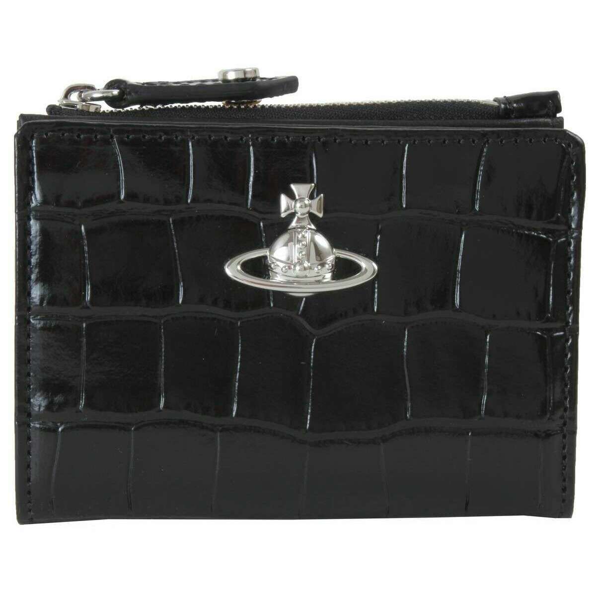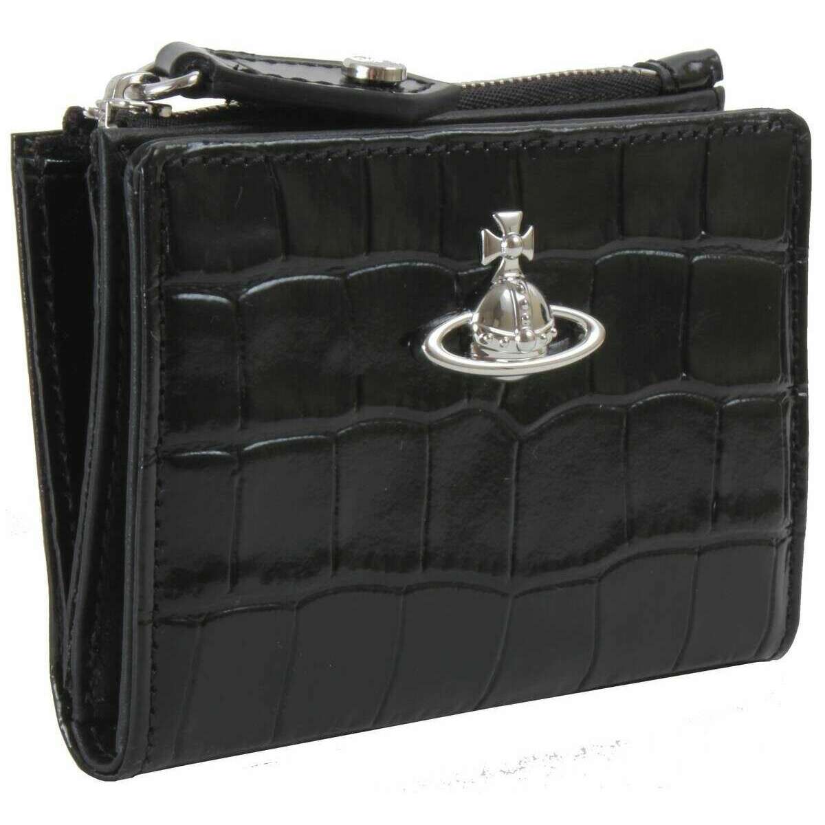 Brought to you by the brand Vivienne Westwood, this black women's embossed croc slim flap card holder is made from 100% calf leather. It measures 9cm(height) x 10.5cm(width) x 2.5cm(depth). All the purses come complete in vivienne westwood packaging. The Vivienne Westwood Embossed Croc Slim Flap Card Holder - Black will make a stunning everyday purse if you want less of a bulky design that fits perfectly in pockets and smaller bags but doesn t falter on style. It has a simple press stud to open and close the card section which offers 4 card slots and on the other side is a zipped coin compartment. The iconic orb sits proudly on the front giving you the perfect companion.