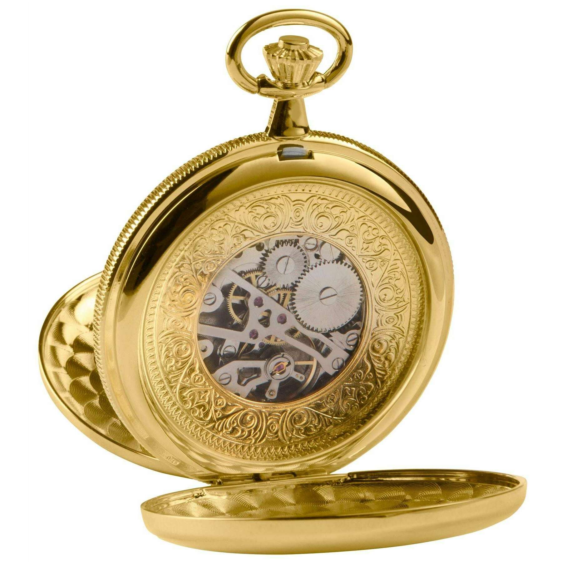 Brought to you by the brand Woodford, this gold men's chain pocket watch is made from gold plated metal. It measures 5.1cm(diameter) x 1.7cm(depth). All the watches come complete with woodford packaging. The Woodford Chain Pocket Watch - Gold features a twin lidded design and runs off a mechanical movement so you can be assured that efficient time keeping will be effortless. When shut the face is protected while your pocket watch is safely stowed away. Details with beautiful roman numeral dials and subtle branding near the centre it is an essential for any gentleman.